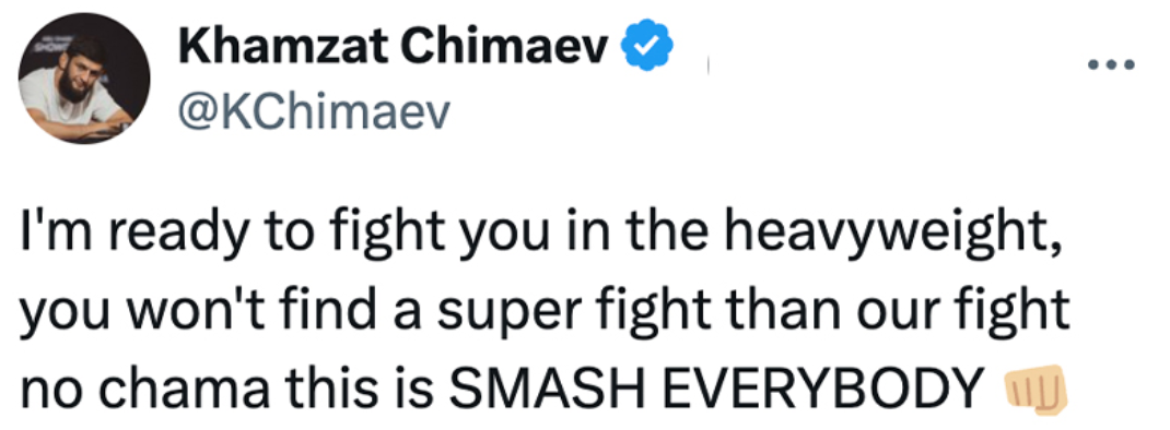 🚨 UFC Middleweight champion Khamzat Chimaev with a call-out to Alex Pereira. Pereira says he isn’t interested in this bout; wants a superfight and to fight at Heavyweight.