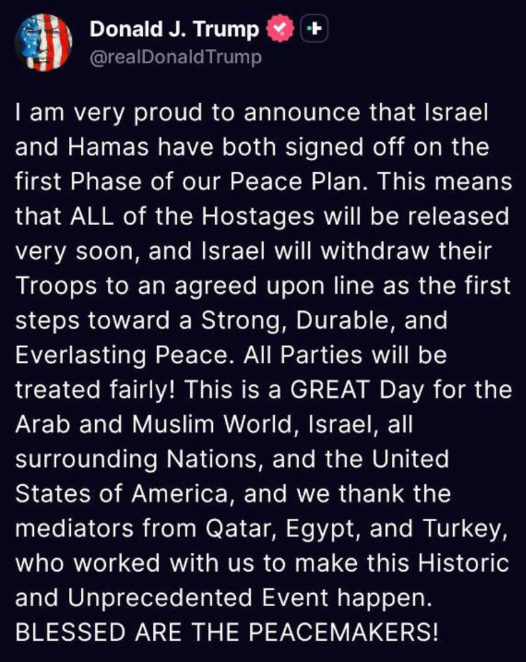 🚨 Donald Trump announces that Israel and Hamas have agreed to phase one of a peace plan.