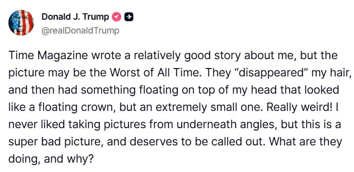 🚨 Donald Trump is not happy with his TIME Magazine cover photo.