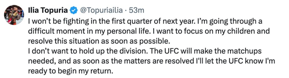 🚨 UFC Lightweight champion Ilia Topuria hints he may be out for some time.