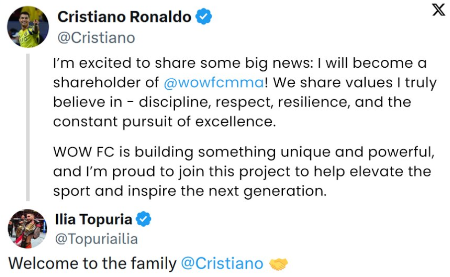 🚨 Cristiano Ronaldo becomes a shareholder of a Spanish MMA organization co-owned by Ilia Topuria.