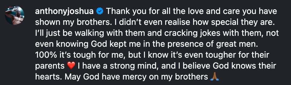 🚨 Anthony Joshua has released his first statement regarding the car crash in Nigeria in which he and two friends were involved. The two friends were tragically killed in the accident.