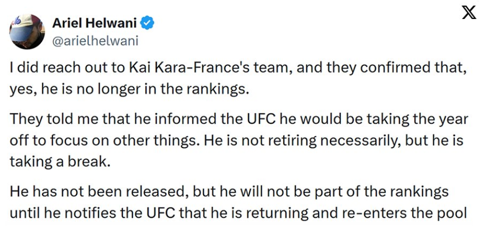 🚨 Ariel Helwani clarifies why Kai Kara-France has been removed from the UFC Flyweight rankings.