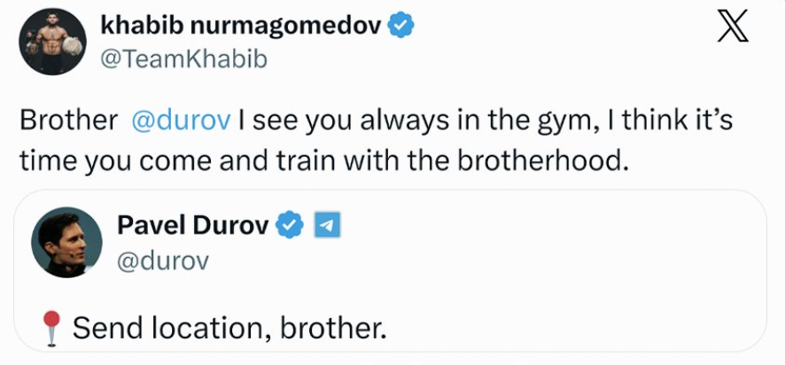 🚨 Khabib Nurmagomedov with a training invite to Telegram CEO & fellow countryman, Pavel Durvov.