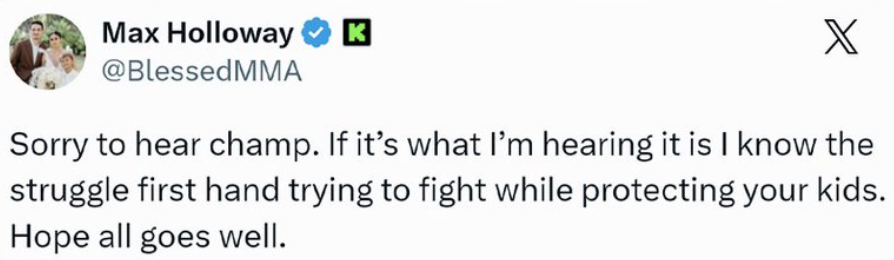 🚨 Max Holloway wishes UFC Lightweight champion Ilia Topuria well in what is rumoured to be a nasty divorce.