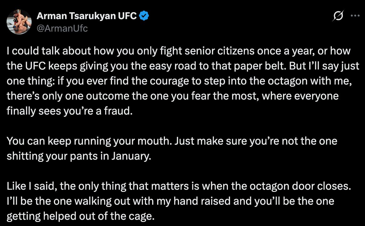 🚨 Paddy Pimblett says Arman Tsarukyan beat an old Beneil Dariush and didn’t beat Charles Oliveira in that many thought he didn’t win that fight. Not to mention Tsarukyan punched a fan on his way to the cage and then when Tsarukyan has his title fight opportunity, he blew it. Pimblett suspects Tsarukyan couldn’t make weight and then after he sat out for eleven months and got offered a bout to avenge his loss with Mateusz Gamrot and didn’t accept. In the Dan Hooker bout, Tsarukyan headbutts him at the weigh-in; Pimblett calls Hooker “sh*t”. All of this is why Tsarukyan isn’t deserving of a title shot according to Pimblett – Tsarukyan responds.