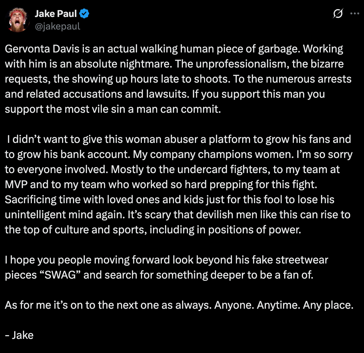 🚨 Jake Paul vs Gervonta ‘Tank’ Davis, scheduled for November 14 in Miami, FL has been canceled, according to a statement from Most Valuable Promotions (MVP) and Netflix. The decision follows a lawsuit filed against Davis by his ex-girlfriend, alleging multiple counts of abuse and kidnapping. MVP stated that Jake Paul will still headline a future Netflix event before the end of 2025 with new details to be announced later. Fans who purchased tickets will automatically receive refunds within 14–21 days.