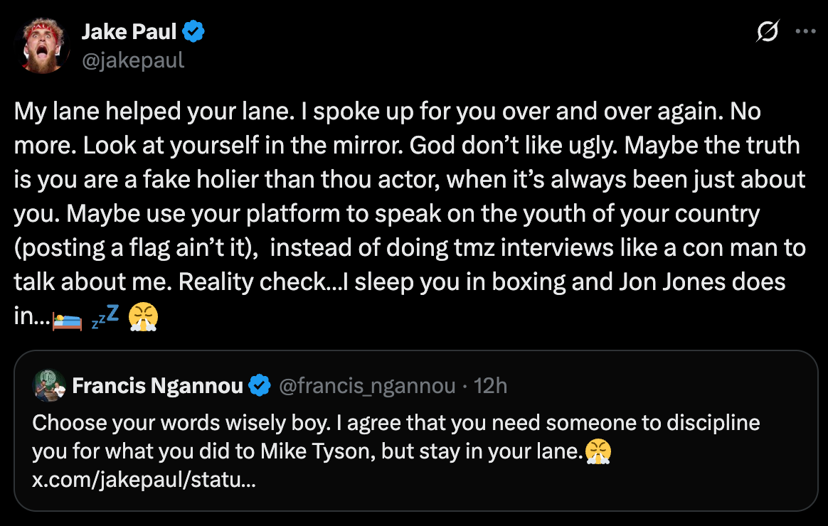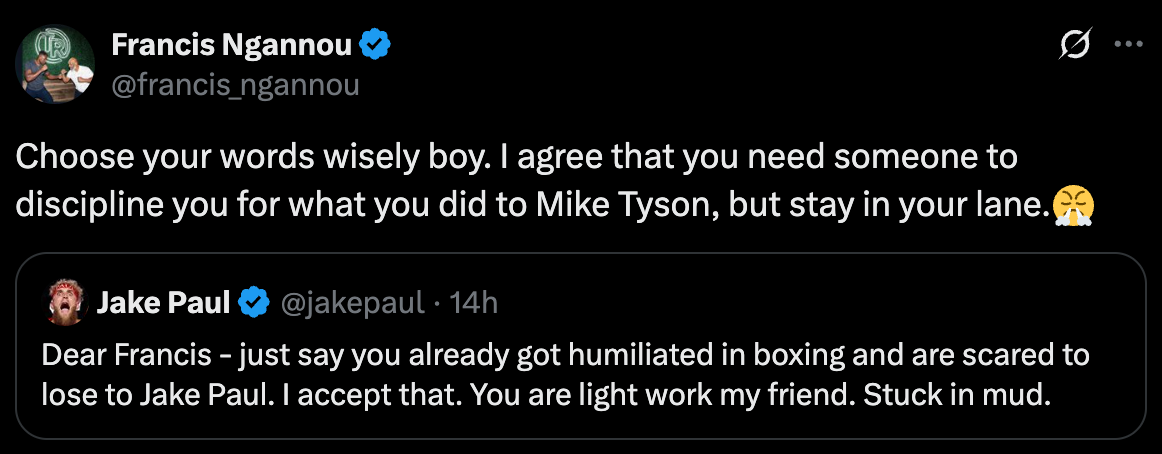 🚨 Francis Ngannou was disrespected on a potential bout with Jake Paul after Paul’s bout with Gervonta ‘Tank’ Davis fell thru.