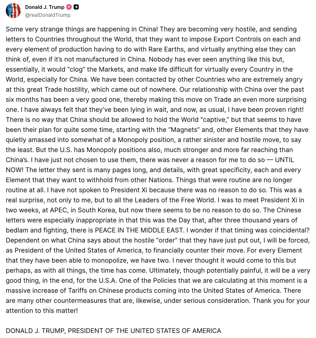 🚨 Donald Trump threatens massive increase on tariffs on China. Also says there’s “no reason” to meet with Chinese President Xi Jinping in the coming weeks.