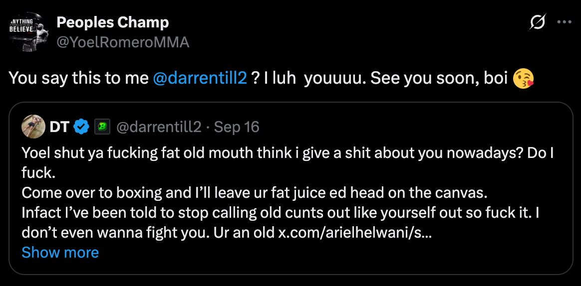 Yoel Romero playfully responds to Darren Till with a cheeky response.